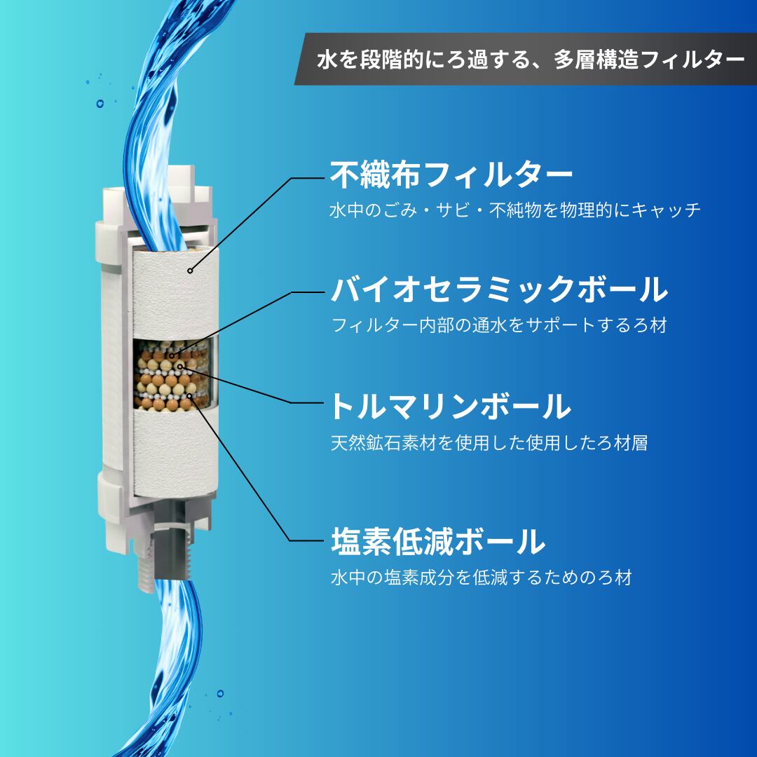 水道水に含まれる残留塩素は、肌や髪の乾燥・パサつきの原因になることもあります。Be-Vitaは、日本の約3〜4倍の塩素濃度と言われるベトナムや、最大約40倍の基準値を持つアメリカなど、海外の過酷な水質環境でも残留塩素を低減。肌あたりのやさしい水に変えます(※1)。